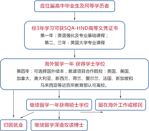 海外升学: 学生完成学业并成绩合格者,可选择赴英国、美国、加拿大、澳大利亚、新西兰及荷兰等国家继续攻读学士和 硕士学位,成绩优异的学生,经外国大学选拔可带薪实习,符合留学国家移民政策的可直接移民获得绿卡。