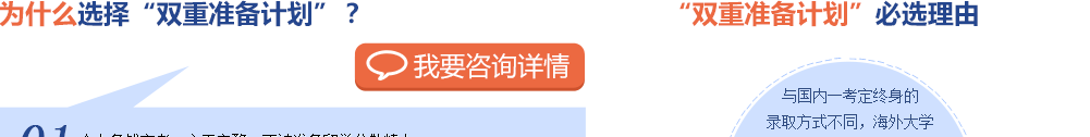 高考留学双保险"是留学桥与国内大学共同针对中国高三学生量身打造的"一手高考、一手留学"项目,在高三学生准备国内高考的期间,报名申请国内大学留学预科课程,并有大学留学预科为就读海外名校作准备,以便在国内高考结束后视录取情况选择就读国内院校或是海外名校,从而避免在准备高考期间又准备留学,两方面都准备不足,高考和留学都受到影响而错过最佳选择的情况,真正做到高考、留学两手抓的双保险。